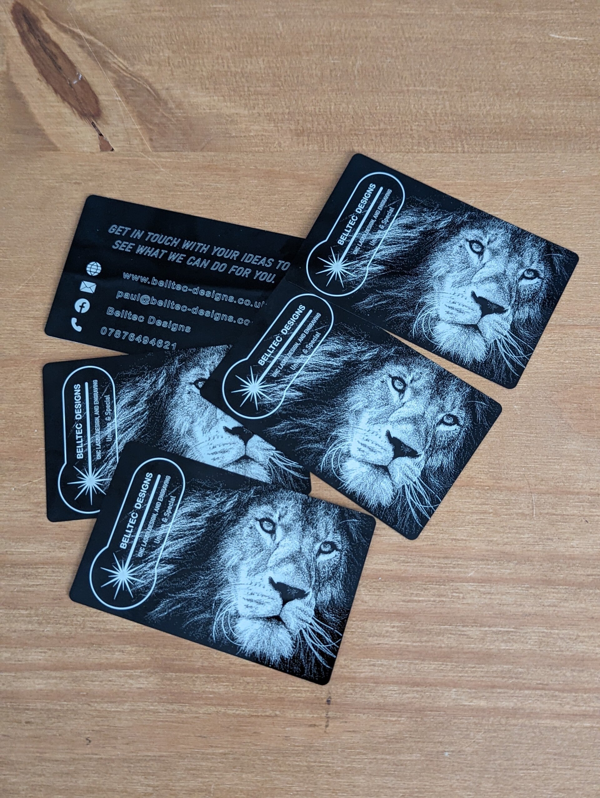 Aluminium Business cards is an area where we can offer bespoke product, unique to you. Every job is priced individually, to enable us to give you the best possible service, and price. Once you contact us, with your ideas, we will run a sample card for you to be able to see the finished product. Not just a rendering. This then gives us an idea as to how long the quantity required will take, to give you an affordable price.